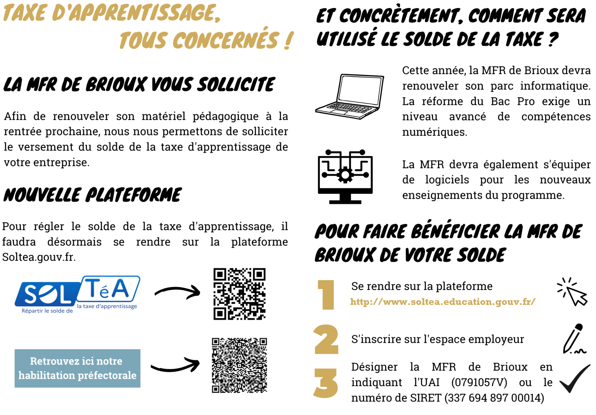 Important : En versant le solde de la taxe d’apprentissage à notre établissement, vous contribuerez au financement de dépenses de fonctionnement et d’investissement en matériel pour nos formations initiales, technologiques et professionnelles.